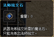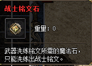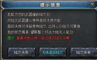铭文/高级铭文洗炼 一、铭文作用 用含有特殊效果的“铭文石”洗炼武器,可以加强“特定技能”的攻击效果,使技能更强大,从而极大提升战斗力。 二、铭文石介绍 2-1、铭文石产出 通过击杀游戏里各地图不同种类怪物(小怪占比80%)获得、游戏内任务获得、游戏内悬赏获得。 铭文石按照职业分为三种,分别为:战士铭文石、法师铭文石、道士铭文石 每个职业的铭文石,都只能洗出本职业的技能铭文。如:用法师铭文石给战士的武器洗炼也只能洗出法师的技能铭文。 三、铭文洗炼 用铭文石对武器进行洗炼称为“铭文洗炼”,铭文石只能通过“铭文洗炼”NPC才能使用。 3-1、洗炼准备 首先,需要在盟重找到“铭文洗炼”NPC。如:盟重土城安全区的铭文师(盟重安全区左上 289 295附近); 其次,与NPC对话,在弹出的对话界面里选择“铭文洗炼”选项,进入洗炼页面。 3-2、开始洗炼 手持需要洗炼的武器,将铭文石放入界面下方的空槽里,点击“洗炼”按钮,就可以开始洗炼了。 也可以右键点击包裹里的武器和铭文石,系统会自动将它们放入正确的位置。 3-3、洗炼结果 不同的武器洗练的结果是不同的,有如下两种情况:
