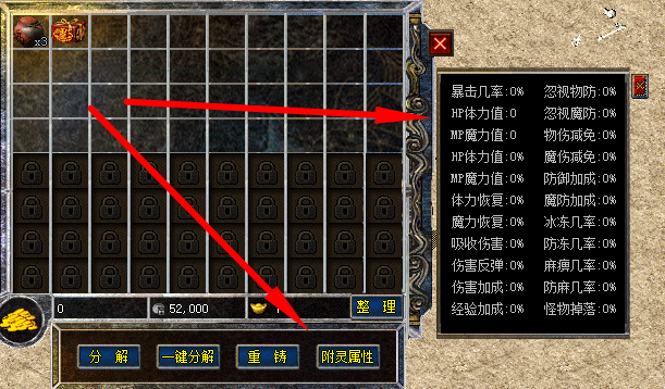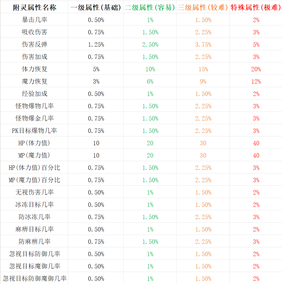 一、什么是首饰附灵? 游戏中的部分首饰,因长期受到怪物的魔气侵蚀,失去了灵气,变得平淡无奇,无法发挥原本强大的威力。当危难再次降临到永光大陆之时,勇士们迫切的需要让被魔气侵蚀的首饰恢复灵气,增强自身的实力,增加战胜妖魔的可能。几经周折,勇士们终于找到了三位远古大神遗留下来的技艺传人----附灵者! 二、首饰附灵的流程 当你在游戏中获得了一些心仪的首饰,想要附灵,就需要你去做一些事情来获得附灵者的认可,帮助你把首饰附灵。 附灵者NPC:各大城市首饰商人 1.点击首饰商人 对话 2.把要附灵的首饰放进物品框内(仅支持头盔、项链、手镯、戒指、护手、腰带、靴子) 3.放入你要附灵的首饰后会弹出界面 4.选择 好的,系统会收走你的首饰并给你发布一个任务,根据任务要求去所在的地图打怪即可。请注意:一定要看清楚要求你去的地图。地图不对,打的怪物无效。 5.去提示中的地图完成打怪,回到任意城市首饰店,继续找老板对话,老板会把附灵成功的首饰给你。 三、附灵效果展示 附灵前 附灵后 附灵成功至少获得一条属性,至多获得三条属性。 角色穿戴附灵首饰可在角色包裹面板-附灵按钮-打开附灵界面查看 首饰的第一次附灵是免费的,如果对当前属性不满意,可以重新选择再次附灵。 再次附灵,将会触发新的条件。从第二次附灵开始,将对每次附灵收取10万金币,另根据装备等级的不同,收取不同的材料。 普通级和沃玛级(沃玛)首饰再次附灵,每次只收取10万金币,无需其他材料! 祖玛级(祖玛)首饰与赤月级(赤月)首饰,第一次附灵也是免费的, 第二次附灵会根据不同级别的首饰,要求提交一定的材料,NPC会有表述需求, 第二次附灵材料收取后,将送大家(祖玛级)2次,(赤月级)8次不再收取材料的附灵次数,每次只手续10万金币, 直到免材料附灵次数满后,再次从第一次免费开始循环,以此类推。 附灵属性及数值展示表: 名词解释: 暴击几率:攻击时触发双倍伤害的几率 吸收伤害:减少受到伤害的百分比 伤害反弹:反弹自身受到外界物理伤害的百分比 伤害加成:对其他目标造成伤害时,根据附灵百分比增加伤害效果 体力恢复:以人物站立不动时恢复体力值的量为基础,根据附灵百分比增加单次恢复量 魔力恢复:以人物站立不动时恢复魔力值的量为基础,根据附灵百分比增加单次恢复量 经验加成:以实际获得的经验值为基础,根据附灵百分比增加 怪物爆物几率:根据附灵百分比,在原有的爆率上增加怪物爆出物品的几率 怪物爆金几率:根据附灵百分比,在原有的爆率上增加怪物爆出金币的几率 PK目标爆物几率:击杀人物时,增加目标爆出穿戴和背包物品的几率 HP(体力值):直接增加角色的HP值 MP(魔力值):直接增加角色的MP值 HP(体力值)百分比:以角色本身的HP值为基础,根据附灵百分比数值增加 MP(魔力值)百分比:以角色本身的MP值为基础,根据附灵百分比数值增加 无视伤害几率:无视当前受到外界的所有伤害几率 冰冻目标几率:对目标造成冰冻效果的几率 防冰冻几率:防止自身被冰冻的几率 麻痹目标几率:对目标造成麻痹效果的几率(只能是物理攻击触发) 防麻痹几率:防止自身被麻痹的几率 忽视目标防御几率:无视目标防御的几率(物理攻击触发) 忽视目标魔御几率:无视目标魔御的几率(魔法攻击触发) 忽视目标防御魔御几率:同时无视目标防御魔御的几率(所有攻击方式都能触发) 一级数值(基础):在附灵完成后,必然会获得。 二级数值(容易):在附灵完成后,较容易获得。 三级数值(较难):在附灵完成后,比较难获得,可以认为是顶级属性。 特殊数值(极难):在附灵完成后,极度难获得,属于超级极品属性。 特别说明: 在极端特殊的情况下,附灵的数值有可能超越极难等级的出现,产出超级特殊的属性,不过这种情况就相当的渺茫了。祝您好运!!! |